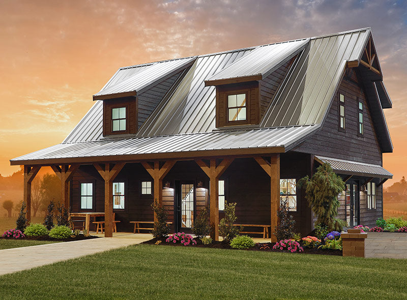 12 / 12 Pitch Roof • Gable Extensions • Dormers and Awning • 8' Timber Porch • Galvalume Metal Roof • 6-Panel Entry Door • Extended Peaks with Brackets • Steps with Landings and Railing