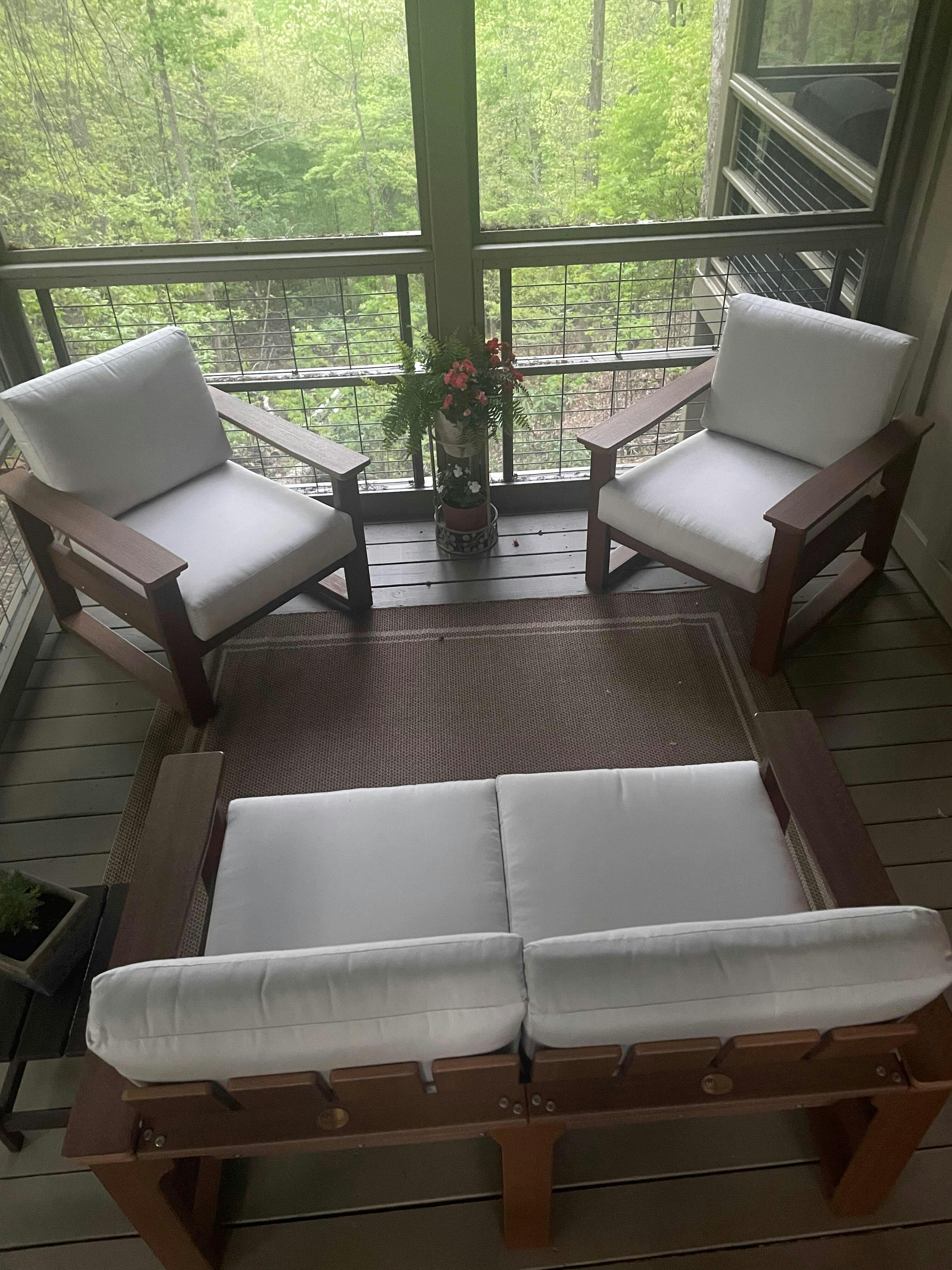 Perfect for endless chats with family, this piece combine high-quality materials like low-maintenance poly, sling seat supports, and plush, weather-resistant cushions.
