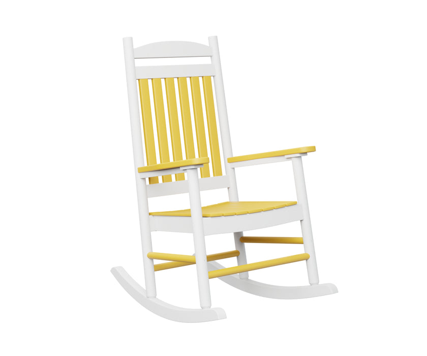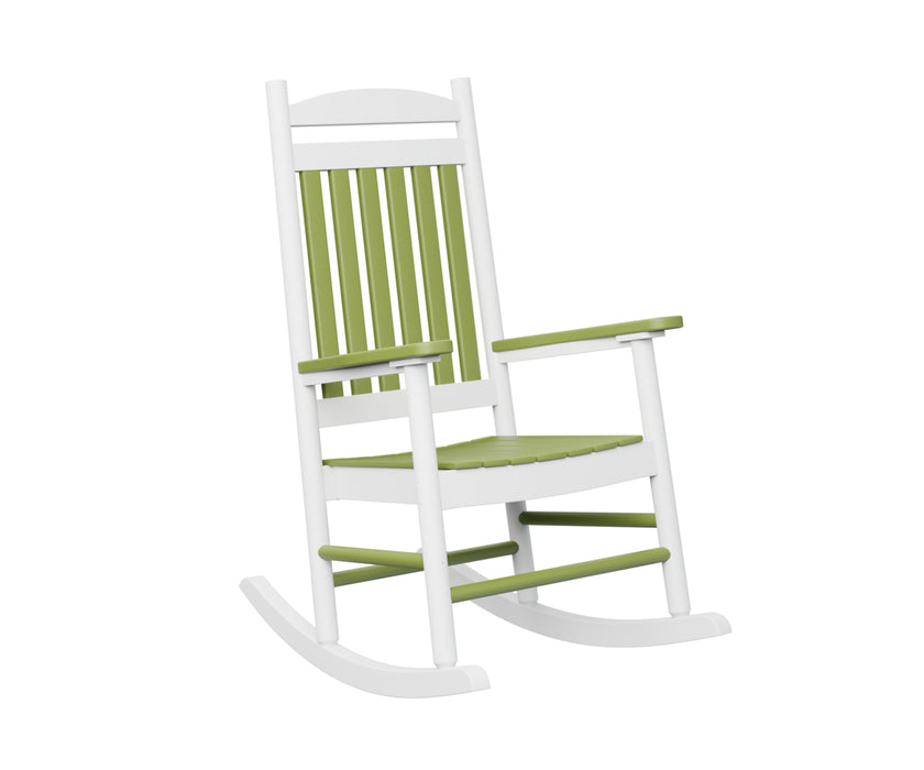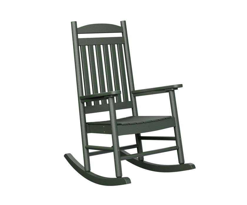 Berlin Gardens porch furniture is artfully made without any exposed screws on the curved seat, slatted back, or sculpted arm rests. Rock gently and relax with added stability and support from the leg beams, which add traditional style. Natural finishes available for back, arm and seat slats only.