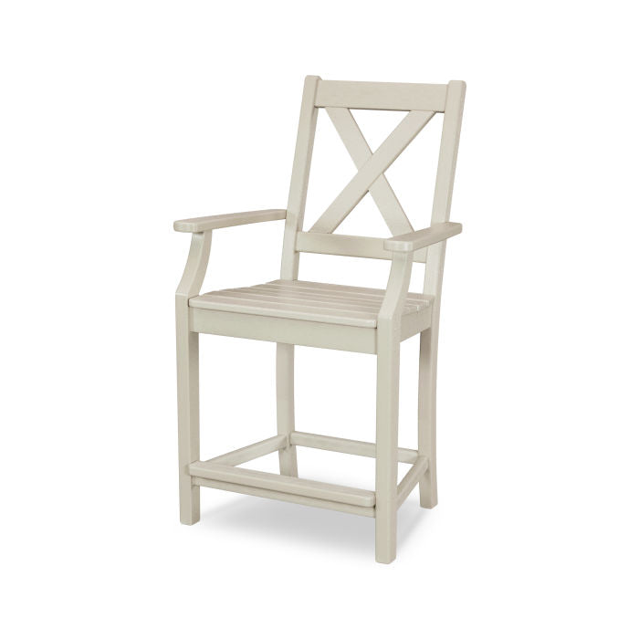 Create a relaxing and stylish outdoor dining experience at just the right height with the Braxton Counter Arm Chair. This counter-height chair features a charming cross back design paired with a comfortably arched back. Pair this chair with POLYWOOD Farmhouse Counter Tables and the rest of the Braxton Collection.